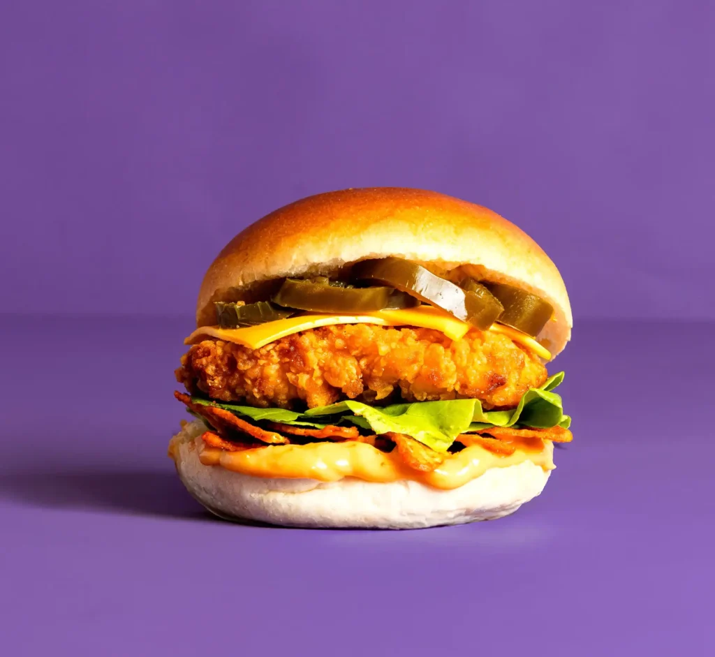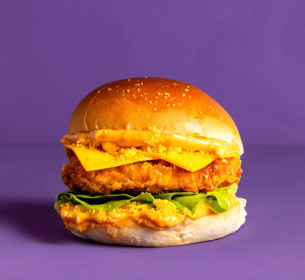 Crispy burger met Doritos® Flamin’ Hot chips, cheddar kaas, sla, jalapeños en samurai saus